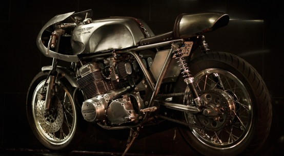 As alterações que Mike da Raccia Motorcycles fez durante os 7 meses que dedicou a este projecto foram tantas que o que aqui vemos da Honda 750 de 1976 é pouco mais do que o motor e a transmissão. Quadro, depósito, carenagem, tudo foi pensado e